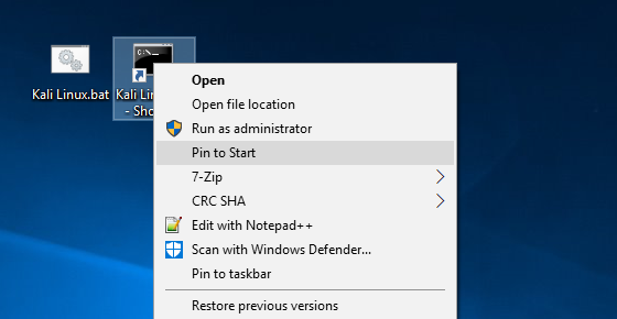 You cannot pin a batch file in Windows 10 (yet?). However, there is a workaround. Instead of creating a shortcut for the batch file, create a shortcut for the cmd.exe (Windows Command Prompt) and pass the batch file as its command line argument with '/C' (= carries out the command and terminates). For example, instead of "C:\Users\choung\Desktop\Kali Linux.bat", set the 'Target' as %windir%\system32\cmd.exe /C "C:\Users\choung\Desktop\Kali Linux.bat". Once the Target is changed, you can 'Pin to Start' or 'Pin to taskbar' from its right-click popup menu.