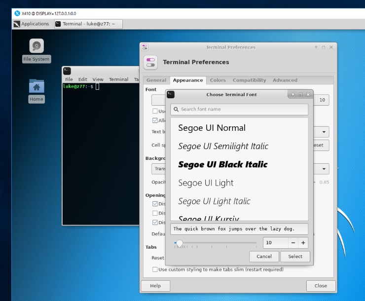 You can access Windows folders from WSL (Windows Subsystem for Linux). Hence you can also configure your X server settings to share Windows TrueType fonts with X410. The following summarizes the steps to enable Linux GUI apps on X410 to access Windows TrueType fonts.